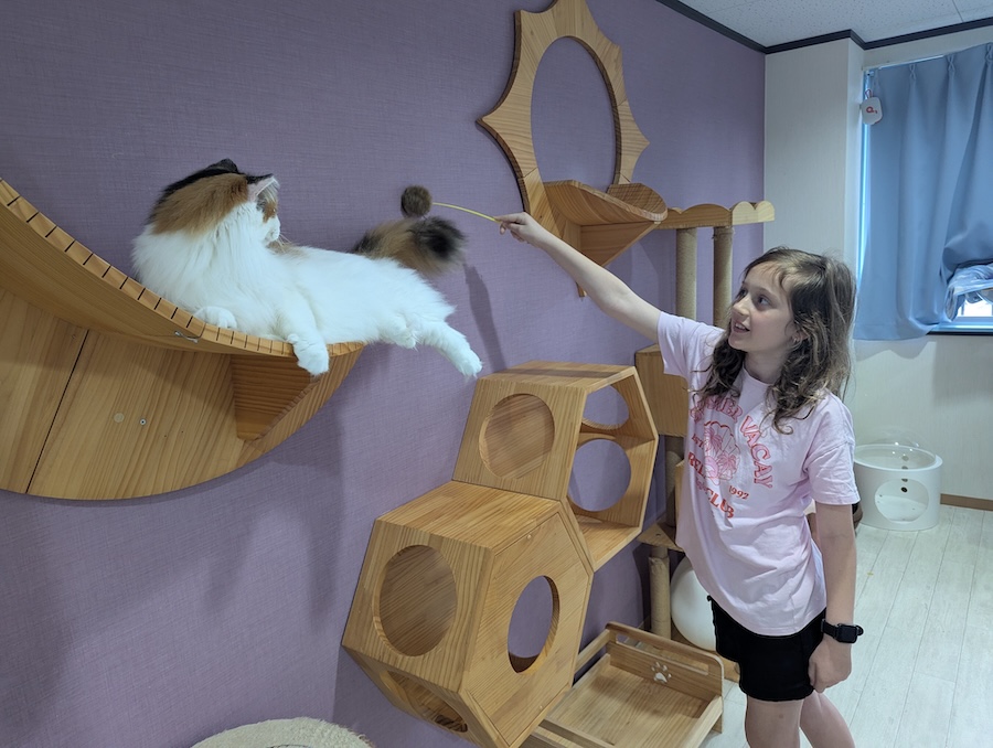 On our final full day in Osaka, we had a sleep-in before we ventured to the Shinsekai area where we explored the streets and also went up the Tsutenkaku Tower for views over Osaka. From there we made our way to the Namba Shrine and also got to try a small cat café where Eloise loved feeding and cuddling the cats.