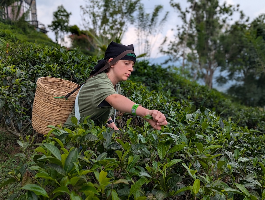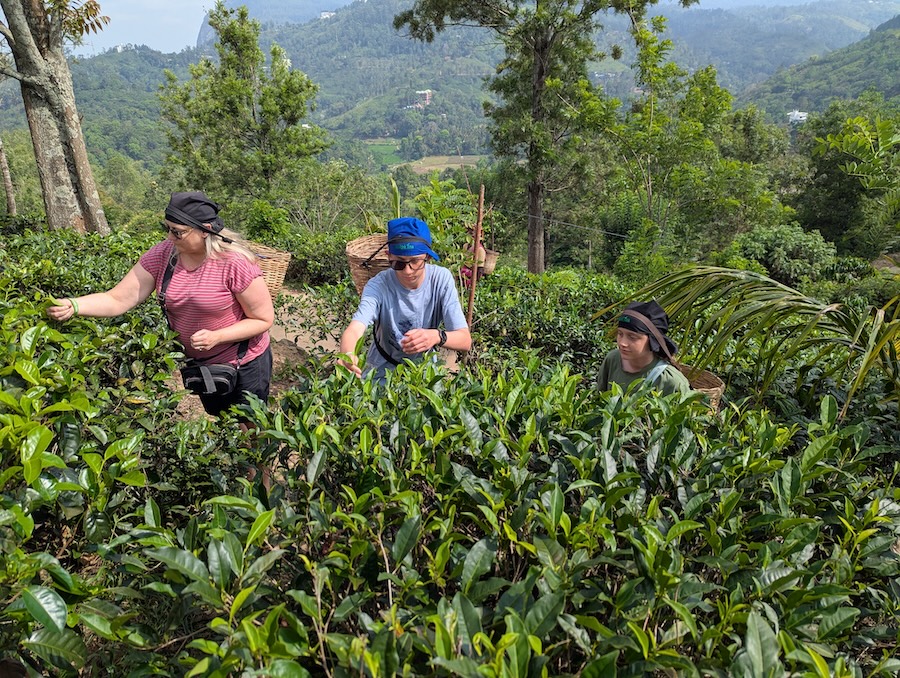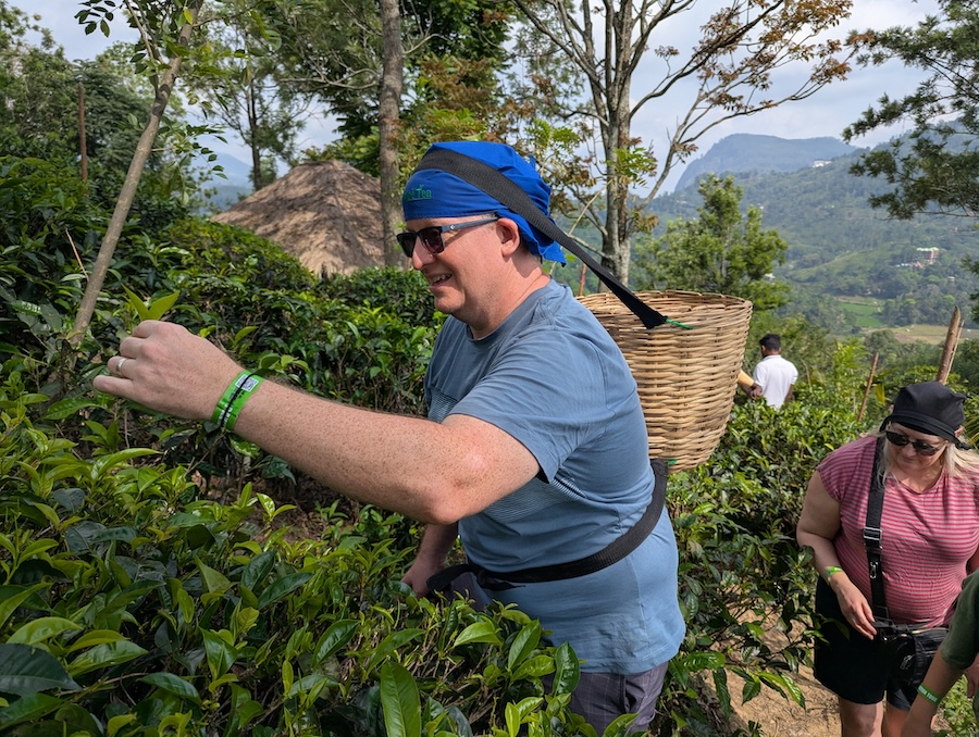 Later we met Suz for lunch and that afternoon, the hotel owner drove us in his tuk-tuk to Halpewatte Tea Factory where we joined the plantation tour. We learnt that Sri Lanka’s tea industry dates back to the 1860s when James Taylor introduced commercial tea cultivation to the island. Before that, Sri Lanka was mainly known for coffee production until a plant disease destroyed the coffee crops. We also learned what tea comes from what leaves and then also got to dress with a traditional tea pickers basket to try hand-picking tea leaves ourselves (which we only did for a short time before we got tired).