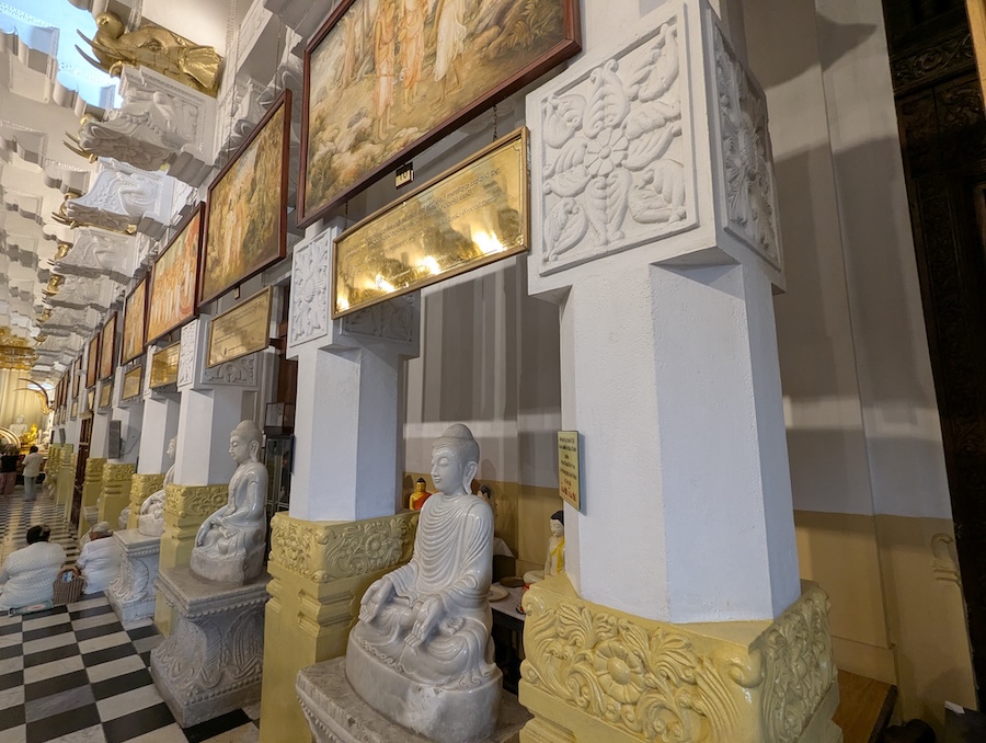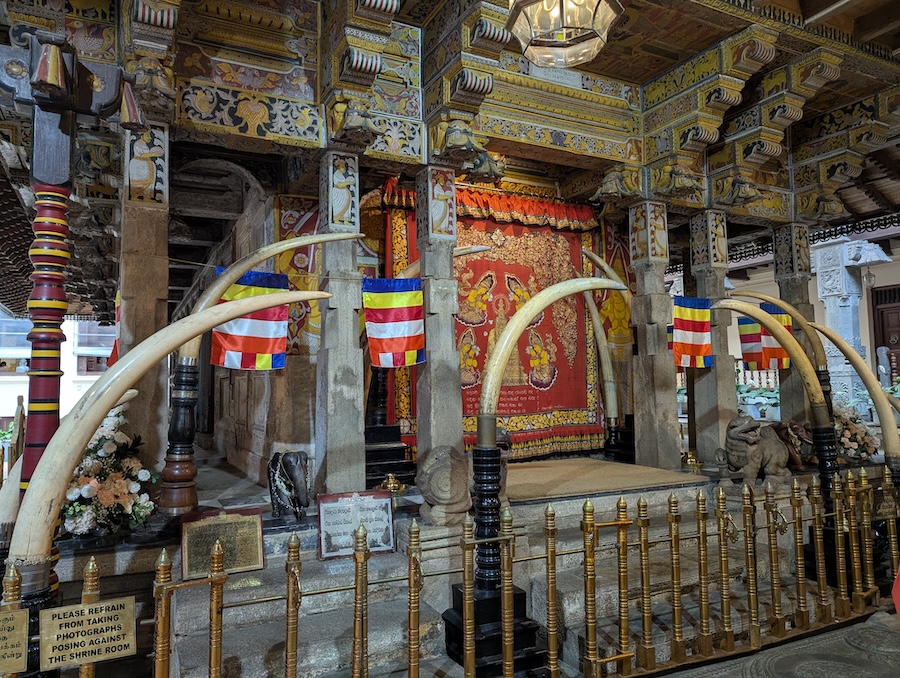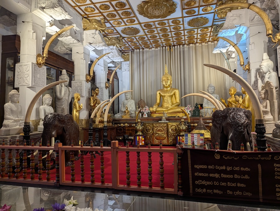 Inside the temple, we walked through a series of halls where people come to pray and offer flowers. The sacred relic itself is hidden away and only taken out during special ceremonies.